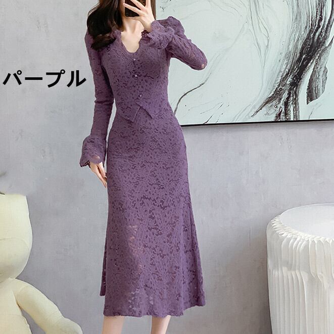 フォーマルドレス ミモレ丈 総レース フレア袖 長袖 結婚式 ワンピース パーティードレス 白 黒 紫 ロング