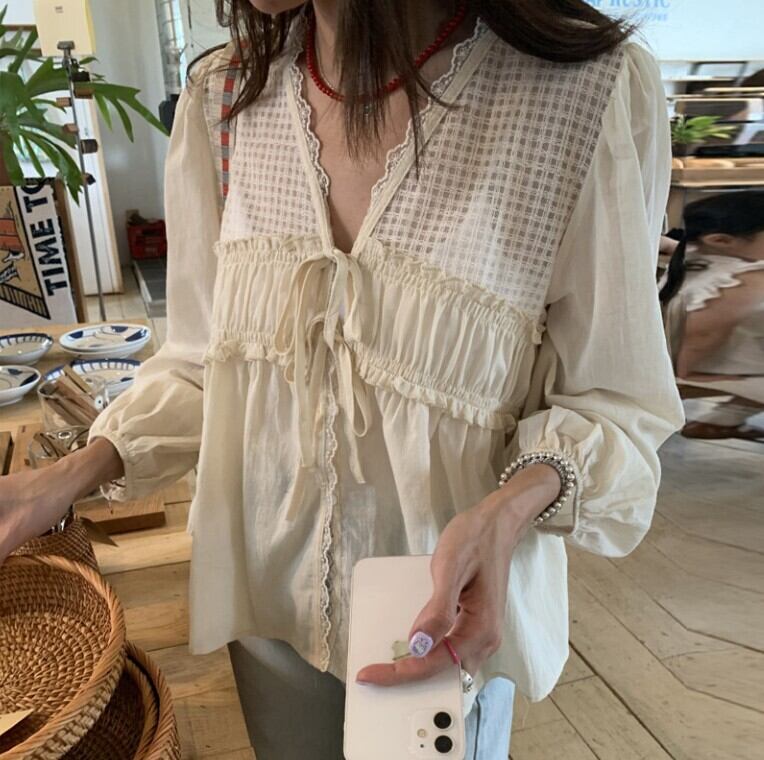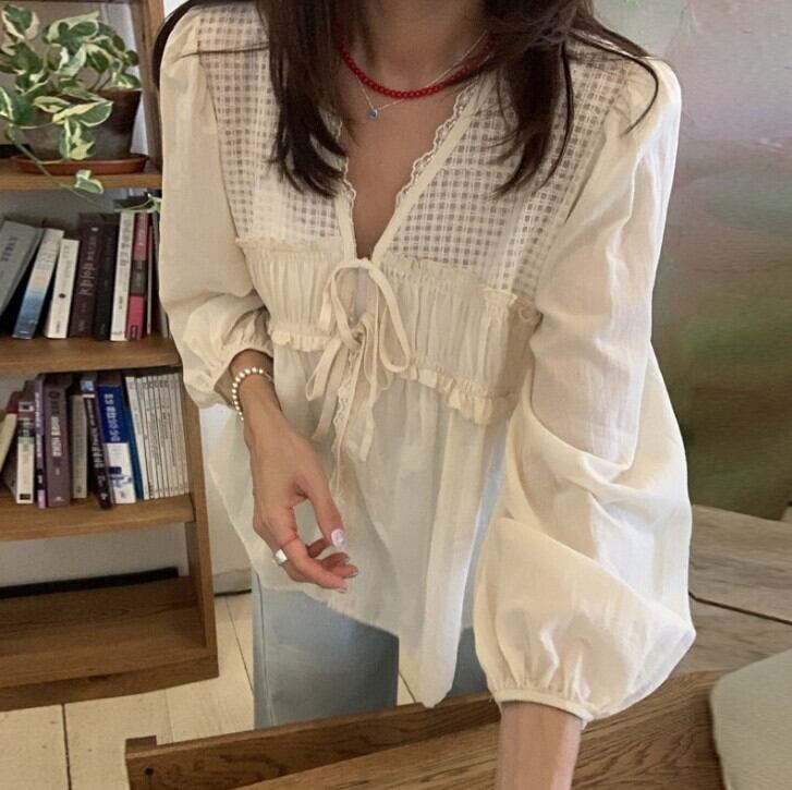 ブラウス シャツ 長袖シャツ レディース トップス vネック Sweet 可愛い 韓国風