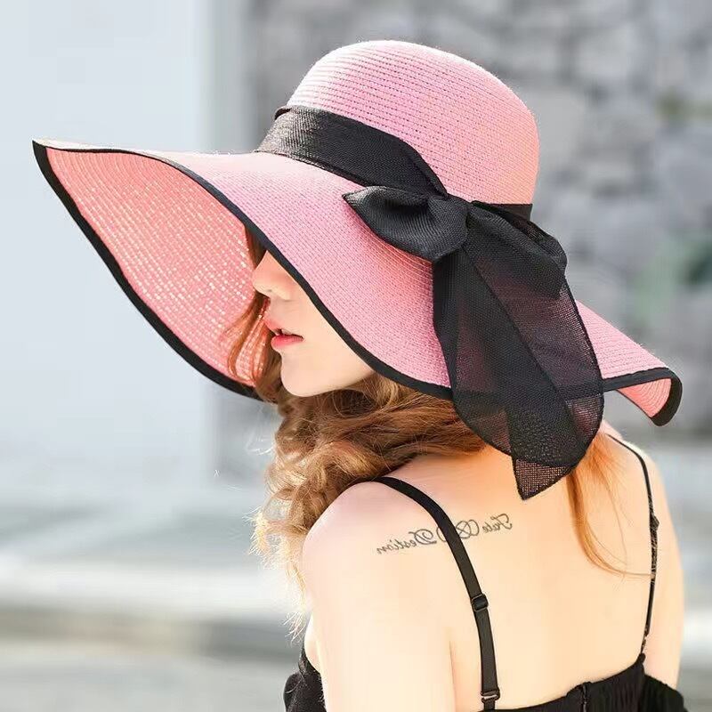 2024 レディース 遮光 リボン 紫外線対策 つば広 エレガント 麦わら風帽子 ベージュ カーキ 女優帽 黒辺