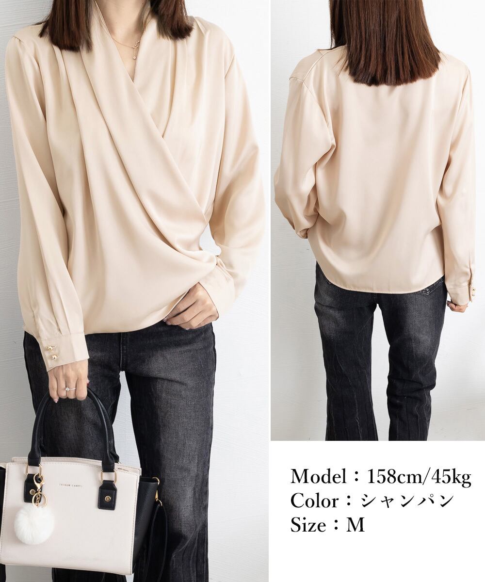 大人女性 サテン風とろみシャツ 通勤服Vネック オフィスカジュアル ドレープシャツ フェミニン 長袖シャツブラウス春夏秋