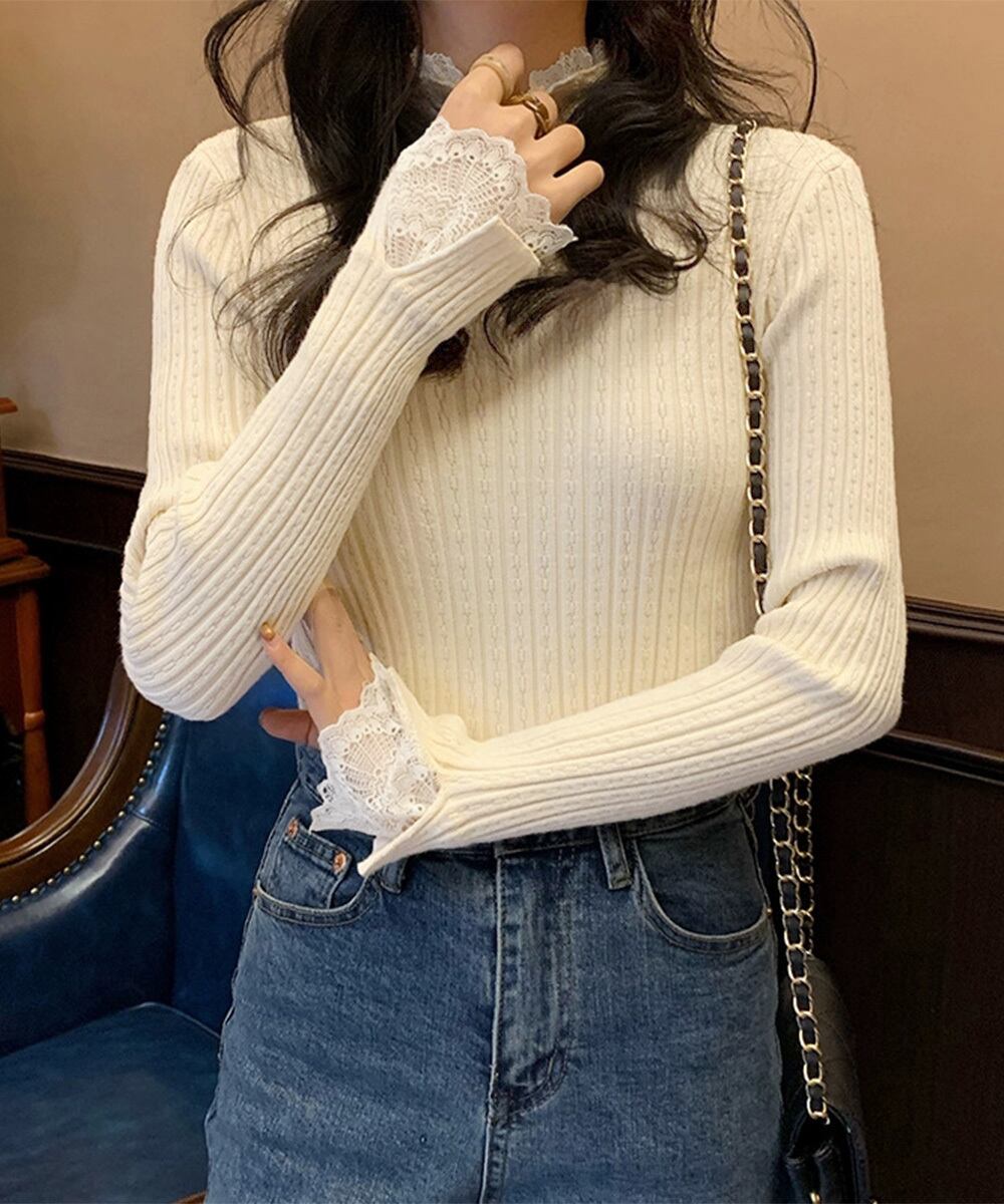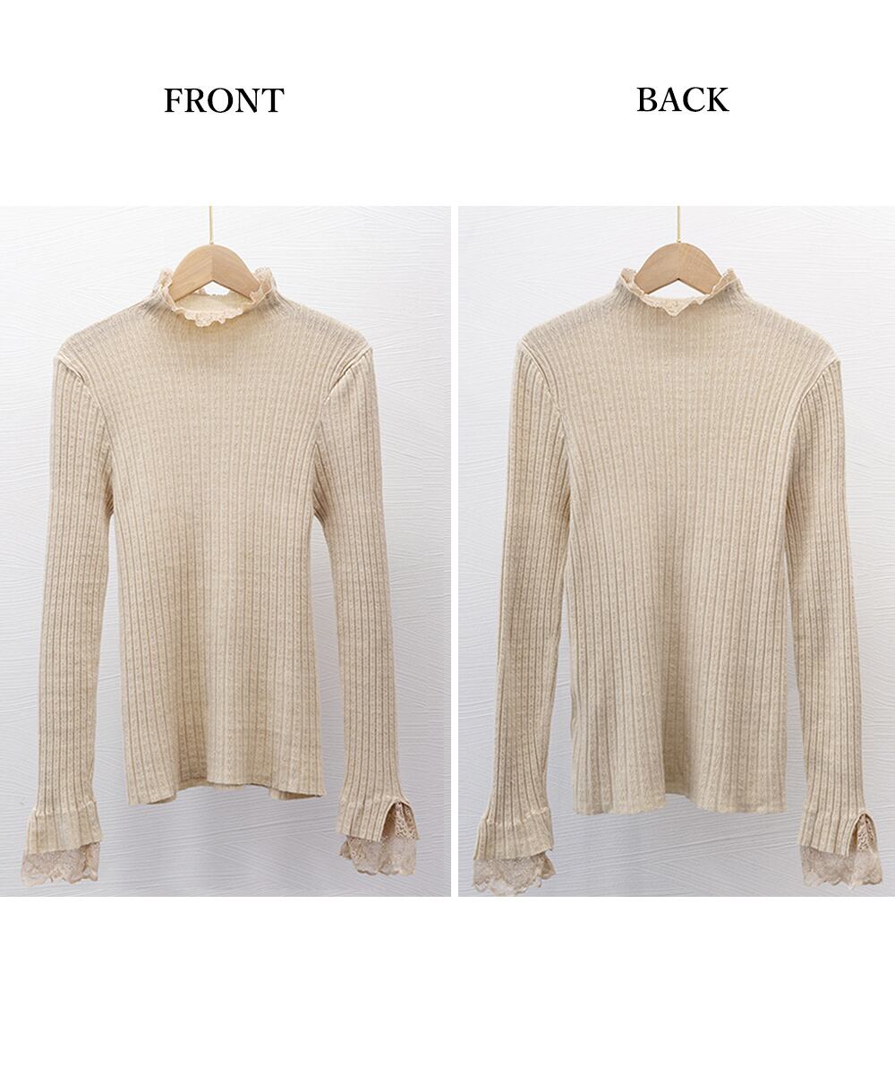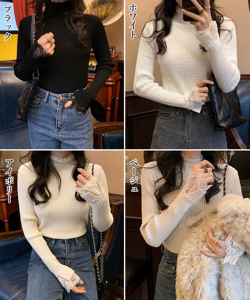 スリムフィットリブニット レースニットウェア きれいめニットプルオーバー 着回しニットインナー ハーフネック ニットソー