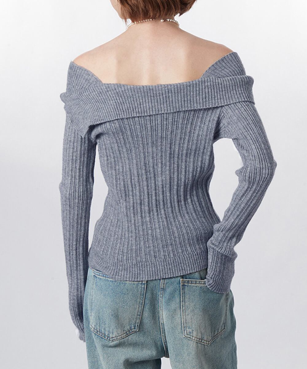 折り返しオフショルダーのデザインが首元を美しく見せ、上品な印象を与えるニットトップス