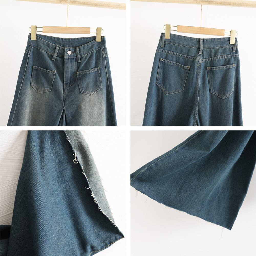 ウォッシュ加工ジーンズ カットオフバギーパンツ ハイウエストスカンツ レトロジーンズ 美脚脚長 ヘムフレアデニムお洒落