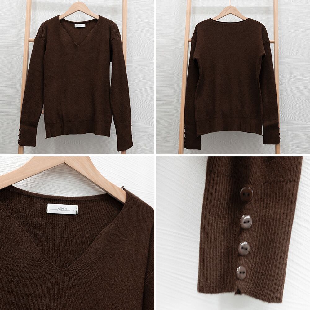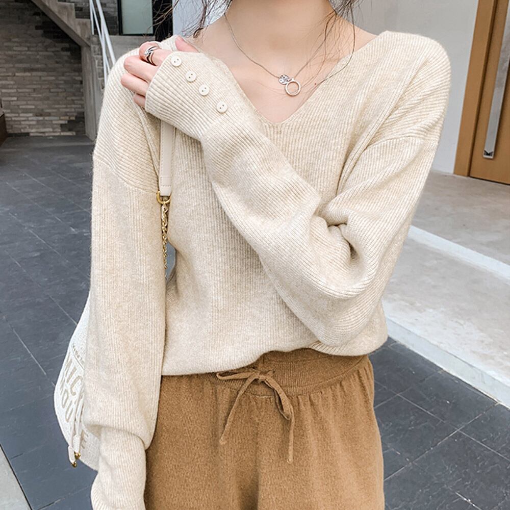 ネックラインスリットと袖にボタンをあしらった大人っぽい韓国風ニットトップス
