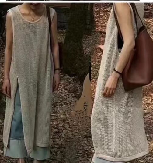 2024夏新作 メッシュ ニットベスト ロング丈ベスト スリット レディースファッション 透かし編み